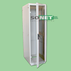 • Передняя дверь выполнена из ударопрочного тонированного стекла обрамленного двумя металлическими пластинами и навешивается на 3-х петлях. Для обеспечения эксплуатационного удобства дверные петли могут быть навешены как с левой, так и с правой стороны. Дверь оснащена ригельным замком с демпфирующими наконечниками на задвижках.